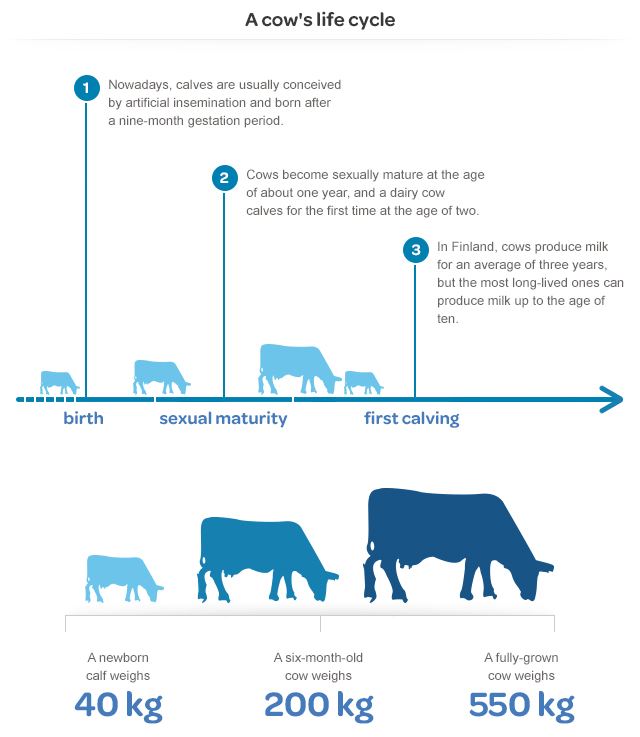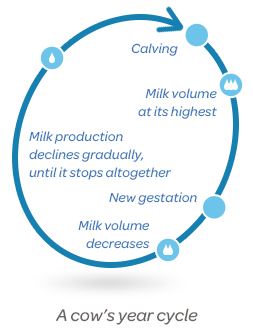 Cows produce 30–60 kilos of milk a day. The volume of milk is at its highest about a month after calving and the period of high milk volume continues from three to five months. Approximately three months after calving, the cow is inseminated again, after which its daily milk production gradually decreases, until its milking is stopped two months before the birth of the new calf.