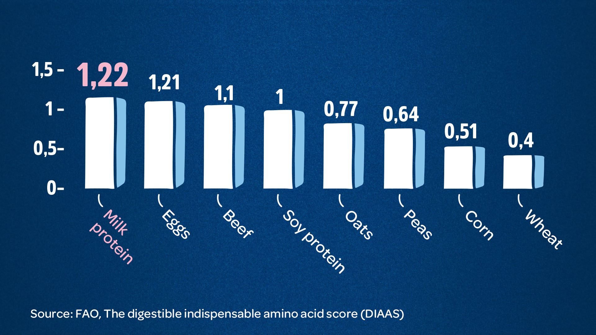Milk protein contains all of the nine amino acids essential for the body and is therefore a “complete” protein. Milk protein also absorbs well, due to which our bodies utilise it efficiently. The nutritional quality of protein sources can be assessed by considering their amino acid composition and the absorption of individual amino acids – in other words, the body's ability to make use of the amino acids. According to the Digestible Indispensable Amino Acid Score (DIAAS) adopted by the Food and Agriculture Organization of the United Nations, milk protein is nutritionally the best natural source of protein.