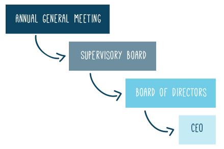 Corporate governance determines the composition of the Valio Supervisory Board and Board of Directors, and the powers of decision vested in different operational components, such as the Annual General Meeting, Supervisory Board, Board of Directors, CEO, Executive Board, Divisions, Group functions, and business processes.