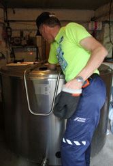 The dairy farmers check the milk in the tank regularly.